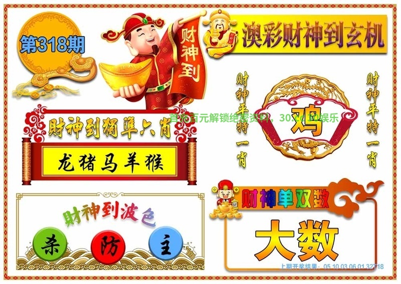 319期:澳彩财神 ①財神到獨準五肖:龙鸡鼠羊猴 ②财神平特一肖:鸡鸡鸡 |